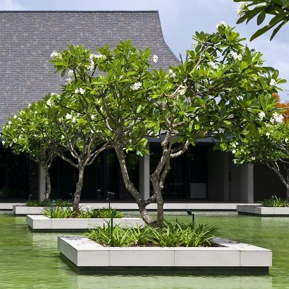 Frangipani is a widely planted tree today, known for its relatively thick, gnarled trunk. The canopy is usually broad with many spreading branches, creating a beautiful form. The highlight of the Frangipani tree is perhaps its elegant white or golden-yellow flowers, which blend together to create a sense of grace and sophistication in the garden.